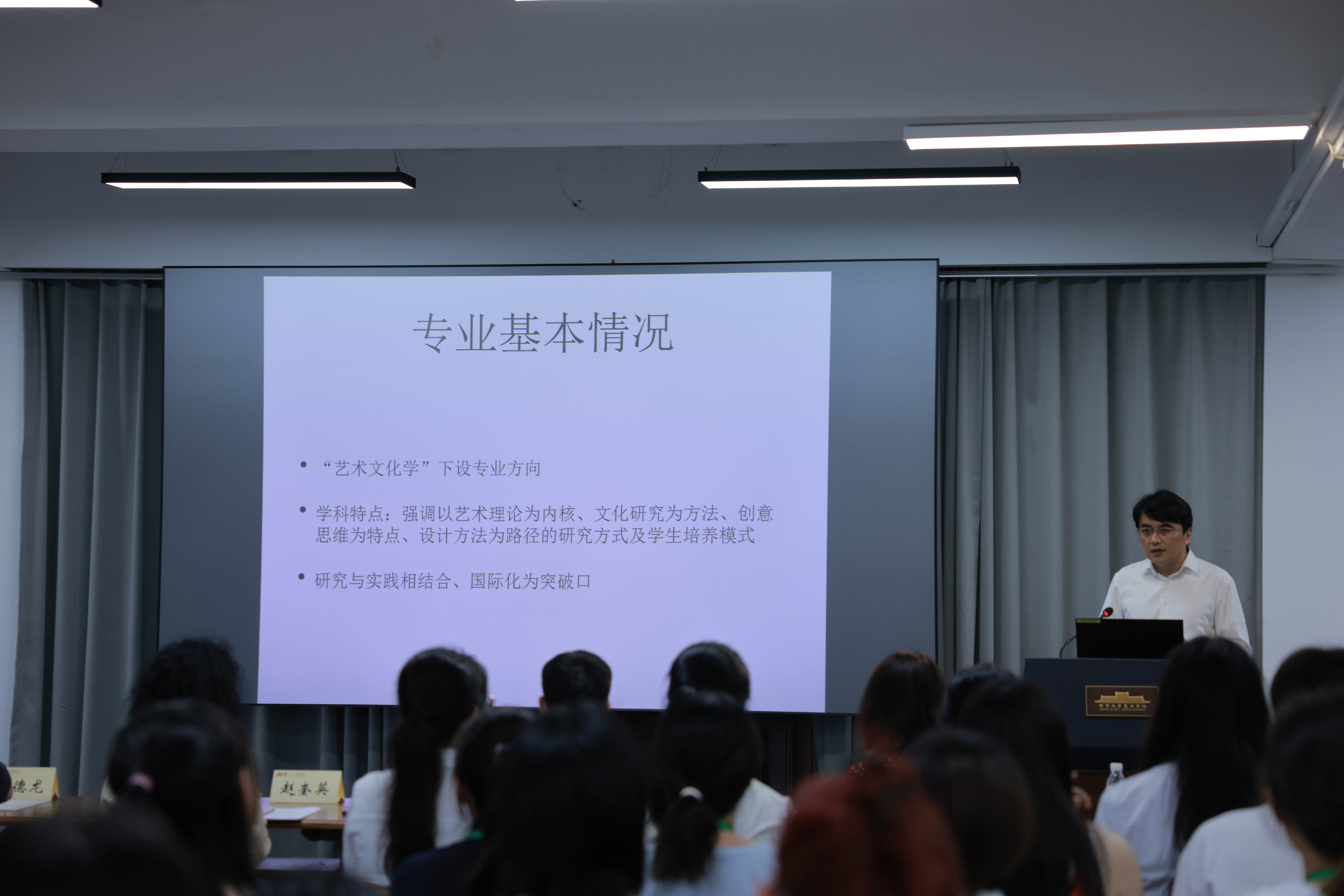 祁林教授介绍了艺术传播方向的情况。首先他阐明了此方向与艺术文化学的“亲缘关系”,指出了该方向的学科特点,即强调以艺术学理论为内核、文化研究为方法、创意思维为特点、设计方法为路径的研究方式和学生培养模式,比较重视实践和国际化。呈现了艺术传播方向的师资情况后,他也介绍了此方向的老师们曾在桃花坞 “沃土”上践行的跨学科尝试,譬如开设艺术与文化创意辅修项目、举办“AI与中法视觉文明互鉴”“AI与中华美学气韵再生”美育创新实践展等。最后他以“to be is to do”作结,希望同学们既能做好学问,也能尝试各样的项目或活动,收获更为精彩的学术生涯。