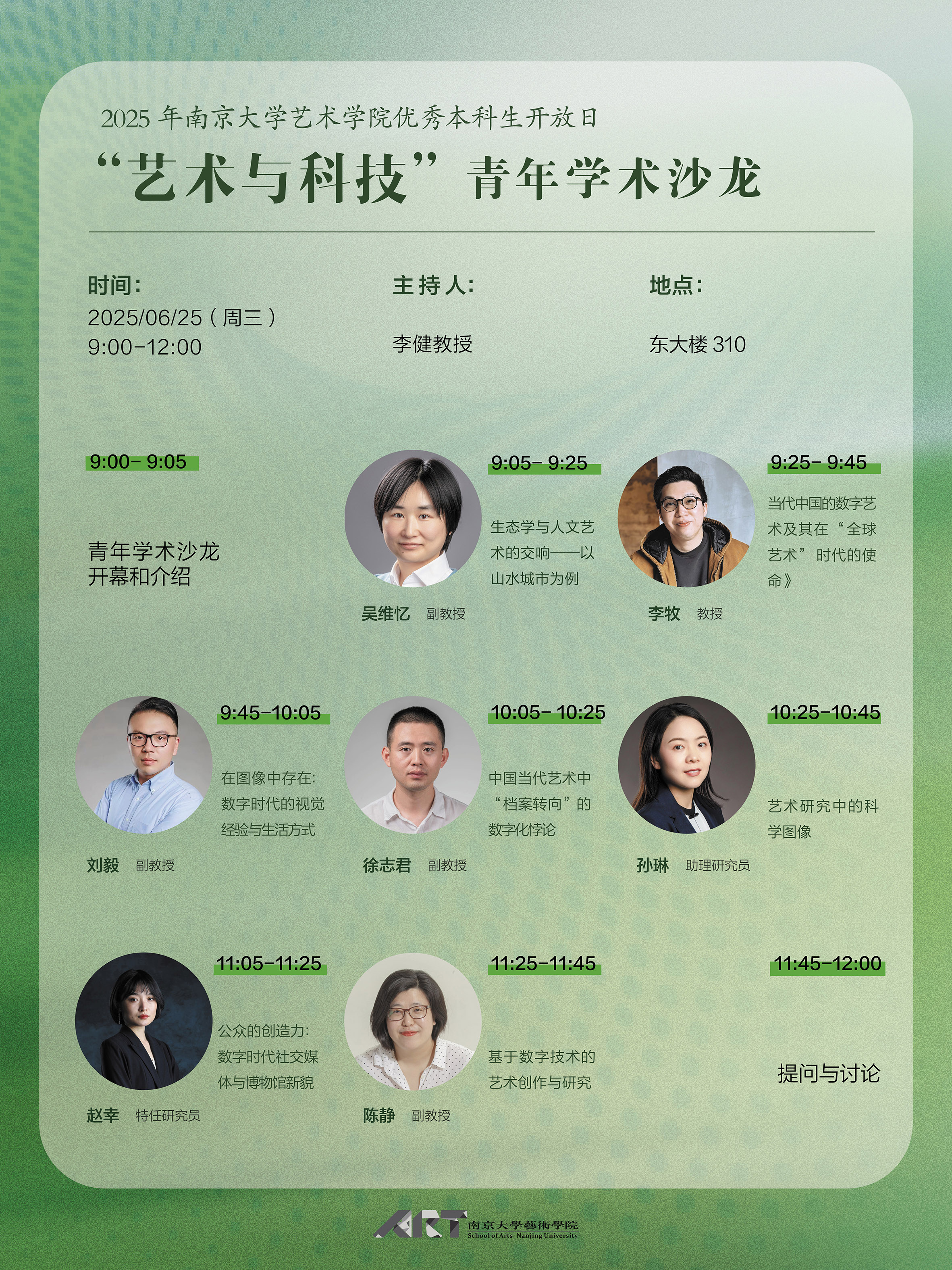 2025年6月25日上午,桃花坞 优秀本科生开放日“艺术与科技”青年学术沙龙成功举办。本次沙龙由李健教授主持,6位青年教师围绕“艺术与科技”议题进行了生动的演讲。