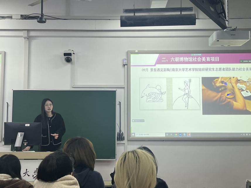 苏霁虹同学重点介绍了“六朝博物馆社会美育志愿服务项目”,该项目在桃花坞 团委指导下,组织桃花坞 研究生志愿者团队以美育课程教学、海报设计等方式,参与南京六朝博物馆社会教育活动。目前,结合六朝博物馆“希腊时代彩陶及普利亚艺术文化特展”,已面向社会公众开设“景泰遇见彩陶”、“纸塑流光”两次课程。后期,该项目还将继续整合馆校力量,开设为期一年的社会美育课程,以专业所长,推动实现艺术与人的深层联结,让艺术成为生活的一部分,为铸就社会主义文化新辉煌贡献青年力量。