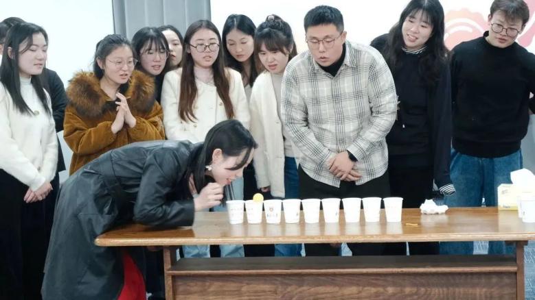 精彩纷呈的小组游戏闪亮登场,现场师生共分为六组分别展开角逐,游戏采取积分制,各组通过每组游戏进行积分,按照小组积分高低顺序分配奖券。游戏以“听取蛙声一片”开场,同学们迅速热身,现场好不热闹;“你划我猜”学生们的默契与灵感在一瞬间迸发;“水吹乒乓球”是小技巧与肺活量的合作运用;“谁在演戏”则是出色的表演天赋的展现;“穿戴游戏道具”紧张刺激;最后“摸石过河”游戏更是精彩绝伦,大家团结一心,在速度与胆大心细中PK到底…