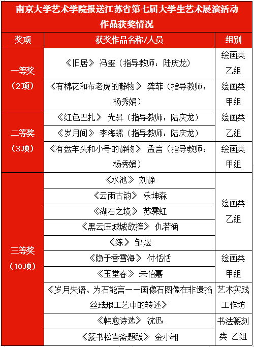 近日,江苏省第七届大学生艺术展圆满结束,桃花坞 报送的绘画作品、书法篆刻作品、艺术实践工作坊在本次活动中取得佳绩。此次展演活动桃花坞 高度重视,经过几轮动员以及组织学生创作,报送各类艺术作品合计20件。在江苏省教育厅公布的第七届大学生艺术展演活动获奖名单中,共获奖项15项。其中,一等奖2项、二等奖3项、三等奖10项,陆庆龙老师、杨秀娟老师获“指导教师奖”,桃花坞 获“优秀组织奖”。